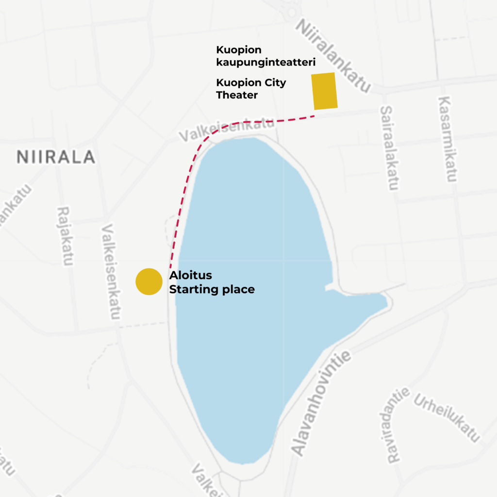 Ulkoilmaosuus ja matka kaupunginteatterille on osa esitystä. Yleisö kulkee ryhmän mukana kohti kaupunginteatteria (matka n. 500 m). Istumapaikoille kuljetaan kaupunginteatterin takaovesta, joten takkeja ym. tavaraa ei viedä narikkaan, vaan mukana katsomoon.