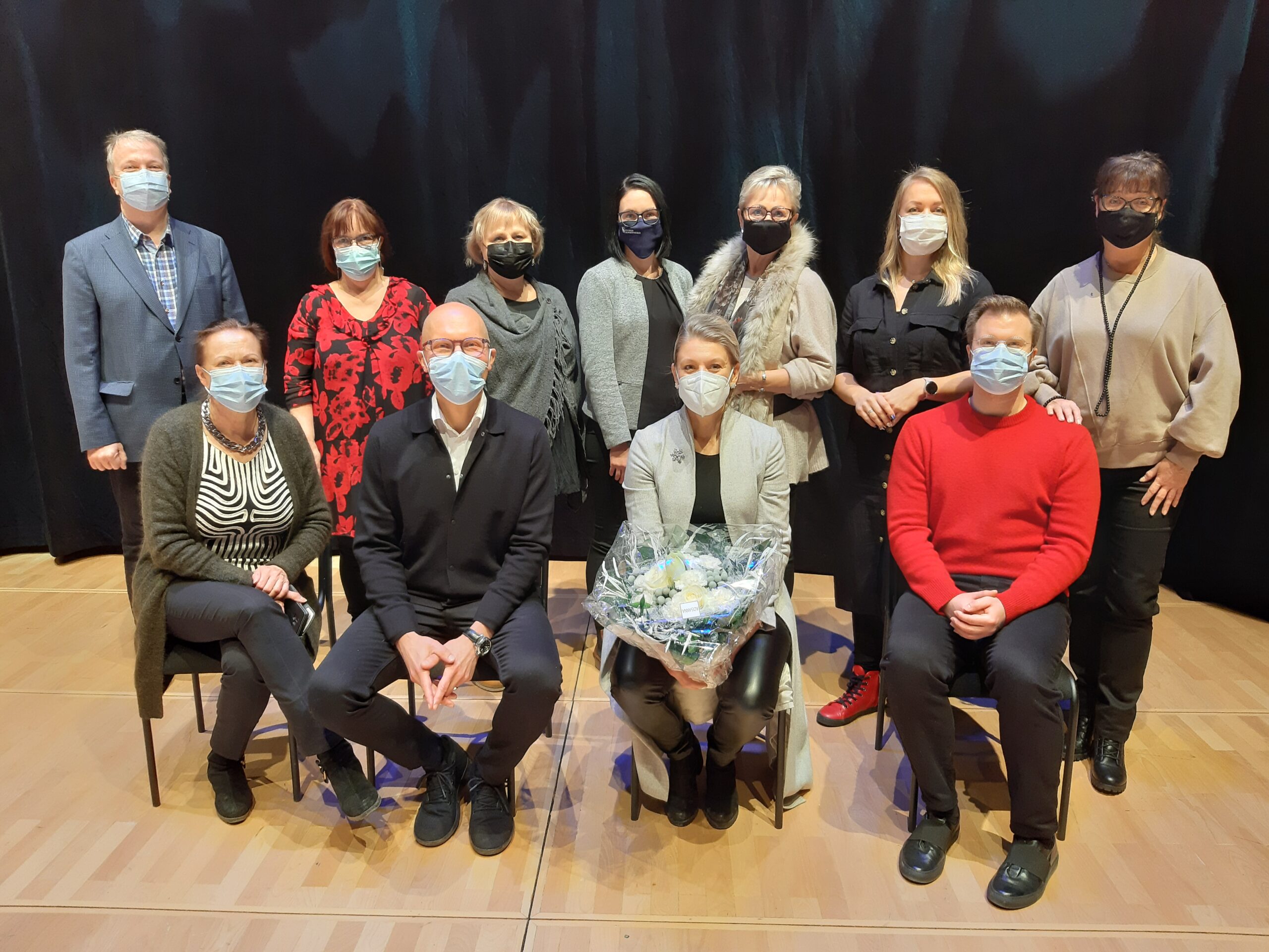 Vasemmalta ylärivissä hallintojohtaja Tuomo Meriläinen, tuottaja Sirpa Miettinen, terveydenhoitaja, vpj. Leila Savolainen, apulaisrehtori Elina Vetoniemi, yhdistyskehittäjä Katriina Lahti, myyntipäällikkö Elena Chiksoeva, kauppias Sirpa Karppi.